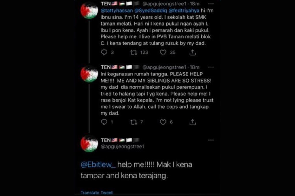 | Antara luahan anak mangsa di aplikasi Twitter selepas dipukul oleh ayahnya. - Foto IHSAN POLIS |