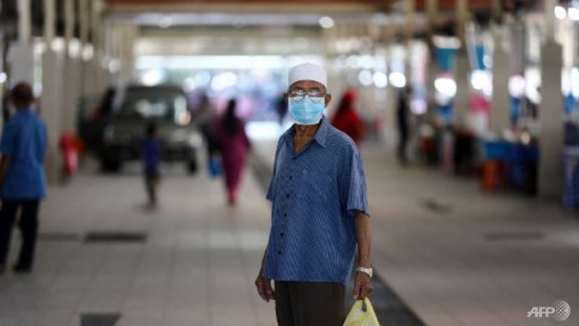 | Seorang lelaki yang memakai pelitup muka, di tengah kebimbangan mengenai penyebaran coronavirus COVID-19, sambil memegang beg plastik barang di Pasar Malam Gadong di Bandar Seri Begawan. |