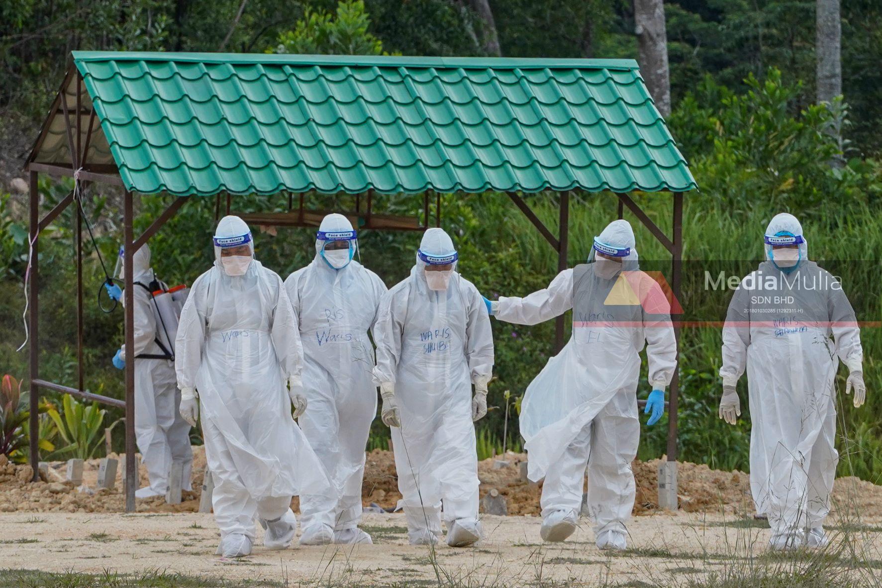 | Shuib (tengah) dengan pakaian pelindung diri (PPE) selepas selesai mengebumikan jenazah isterinya, Allahyarham Siti Sarah Raissuddin di Tanah Perkuburan Islam Kampung Sungai Pusu, Gombak hari ini. |