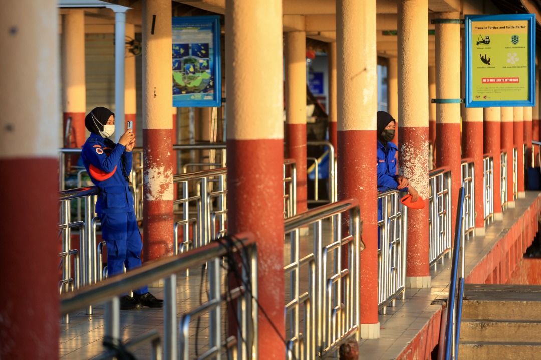 | ANGGOTA Angkatan Pertahanan Awam (APM) mengambil gambar rakannya sebelum bermula Program Imunisasi Covid-19 Pulau Perhentian di Sekolah Kebangsaan Pulau Perhentian. |